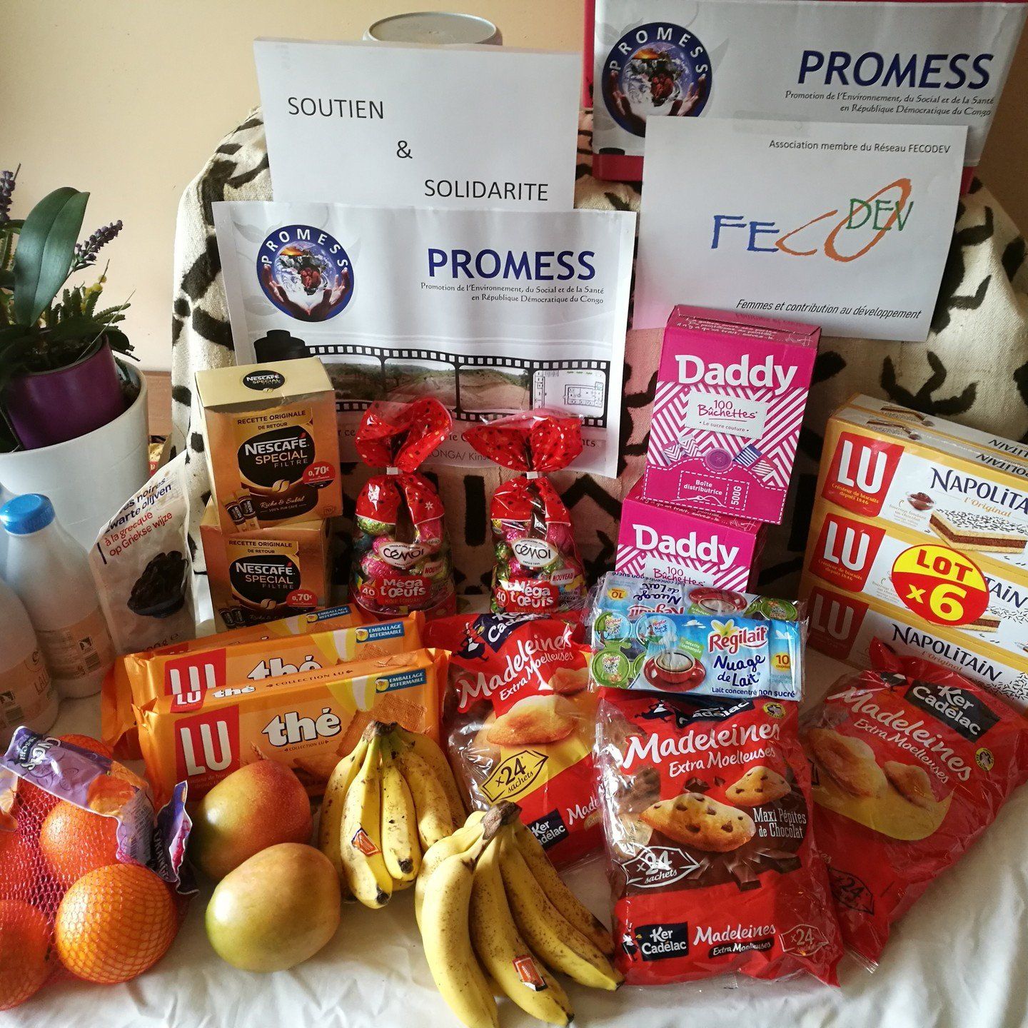 En avril 2020, au plus fort de la première vague du COVID-19, qui a fait tant de victimes, l'association PROMESS-RDC France est allée montrer sa solidarité, sa compassion et son soutien au personnel d'encadrement de l'EHPAD "La chocolatière" à Noisiel (Marne la Vallée) à l'est de la région parisienne. Dans le panier: du chocolat, des gâteaux, des fruits, du café , du lait et du sucre...